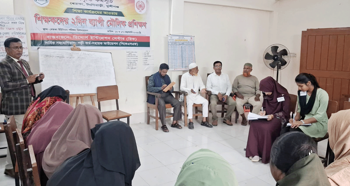 নিজস্ব প্রতিবেদক : রিক সংস্থার আয়োজনে মুন্সীগঞ্জের টঙ্গীবাড়ীর বেতকা ইউনিয়নে সমৃদ্ধি শিক্ষা কাযর্ক্রমের আওতায় শিক্ষকদের ২ দিন ব্যাপী মৌলিক প্রশিক্ষণ অনুষ্ঠিত হয়েছে। গত সোম ও গতকাল মঙ্গলবার রিসোর্স ইন্টিগ্রেশন সেন্টার (রিক) এর আয়োজনে ও পল্লী কর্ম-সহায়ক ফাউন্ডেশন (পিকেএসএফ) এর সহযোগিতায় শিক্ষকদের ২ দিন ব্যাপী এ মৌলিক প্রশিক্ষণের উদ্বোধন করেন বেতকা প্রবীণ কমিটির সভাপতি মোঃ ইউসুফ সিকদার। প্রশিক্ষণে রিসোর্স পার্সন ছিলেন মাস্টার ট্রেইনার বাংলা রিফা আক্তার, গণিত মোঃ খোরশেদ আলম শেখ এবং ইংরেজি শ্যামল চন্দ্র রায়। এসময় উপস্থিত ছিলেন রিক মুন্সীগঞ্জ এরিয়া ম্যানেজার মোঃ মোয়াজ্জেম হোসেন, রিক আব্দুল্লাপুর শাখা ব্যবস্থাপক মোঃ সাইদুর রহমান, উপজেলা কর্মসূচি সমন্বয়কারী সৈয়দ ওয়াহিজুর রহমান, সমৃদ্ধি স্বাস্থ্য কর্মকর্তা শুভদেব মিস্ত্রীসহ ইউনিয়ন সচিব ও মেম্বারবৃন্দ।