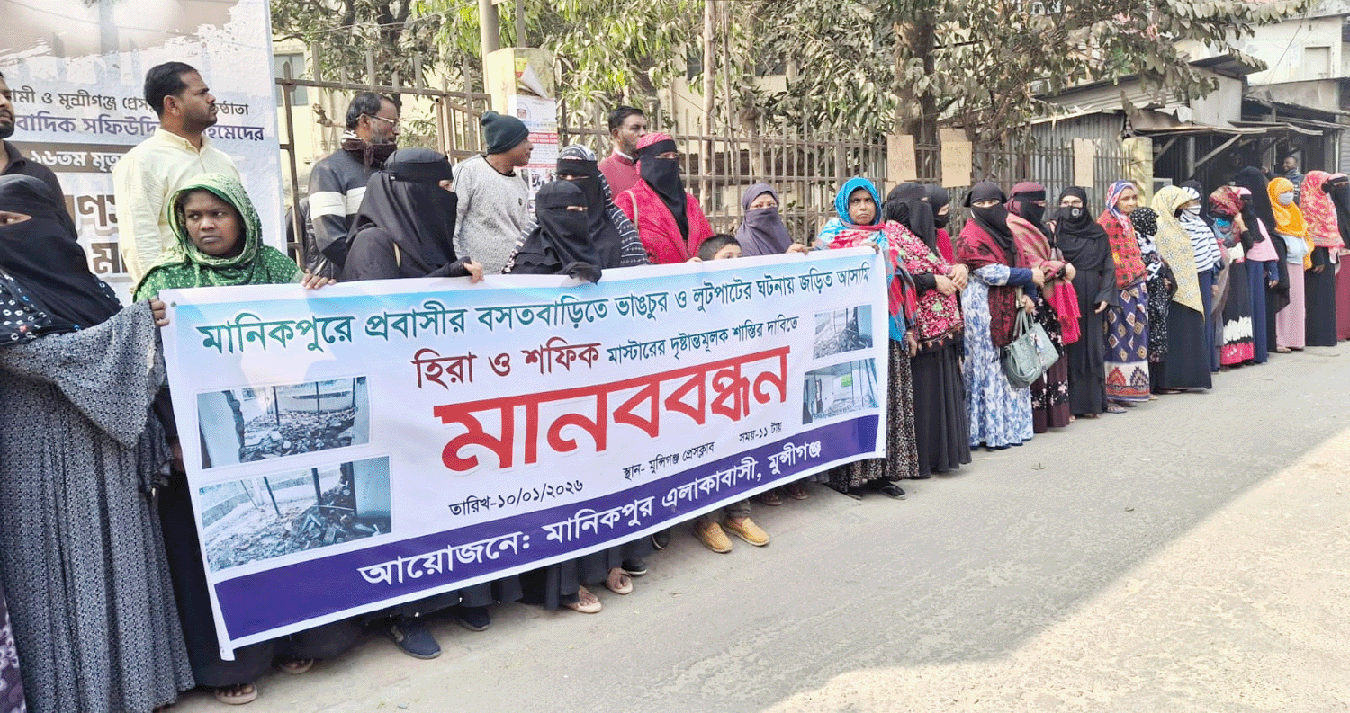 নিজস্ব প্রতিবেদক: মুন্সীগঞ্জ শহরের মানিকপুর এলাকায় বসতঘরে হামলা, ভাঙচুর ও লুটপাটের ঘটনায় দায়ের করা মামলার আসামিদের দৃষ্টান্তমূলক শাস্তির দাবিতে মানববন্ধন করেছে এলাকাবাসী।