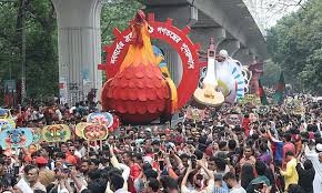 ইউনেস্কো স্বীকৃত এই সাংস্কৃতিক ঐতিহ্যে অংশ নিতে সকাল থেকেই চারুকলা এলাকায় ভিড় করেন বিভিন্ন শ্রেণী-পেশার মানুষ। অনেককে দেখা যায় সাদা-লাল রঙের ঐতিহ্যবাহী পোশাকে সজ্জিত হয়ে শোভাযাত্রায় অংশ নিতে। শোভাযাত্রার শুরুতে ছিল মহানগর পুলিশের ১০টি ঘোড়সওয়ার দল। তাদের পেছনে জাতীয় পতাকা বহন করে প্রায় ২০০ শিক্ষার্থীর একটি দল অংশ নেয়। এরপর মূল ব্যানারসহ বিশ্ববিদ্যালয়ের বিভিন্ন হলের প্রাধ্যক্ষ, বিভাগীয় চেয়ারম্যান, শিক্ষকবৃন্দ, জাতীয়তাবাদী সাংস্কৃতিক সংসদ, কবিতা পরিষদ এবং বিশ্ববিদ্যালয়ের কর্মকর্তারা শোভাযাত্রায় অংশগ্রহণ করেন।